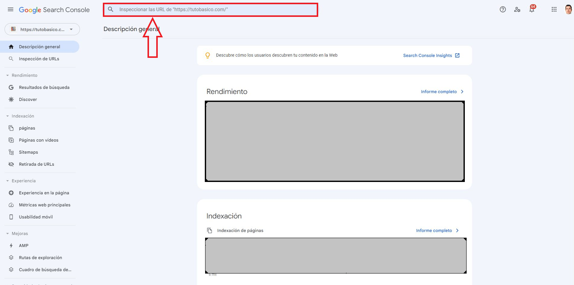 Se abrirá la página de Search Console. Debemos pegar el enlace de nustra página en el recuadro de texto de la parte superior
